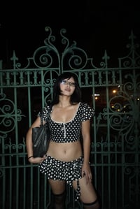 this set includes a cropped button-down with lace trimmings and puff sleeves, paired with the bloom beneath skirt—a micro mini skirt featuring bloomer shorts peeking through and a tie-up ribbon detail on the waistband. crafted from 95% cotton and 5% spandex stretch twill, it is double-lined for added durability. the fabric offers a comfortable stretch for ease of movement. this skirt is available in black & white polka dot, white & black polka dot, dusty punk & white polka dot, red & black polka dot, black, cream, and dark grey.